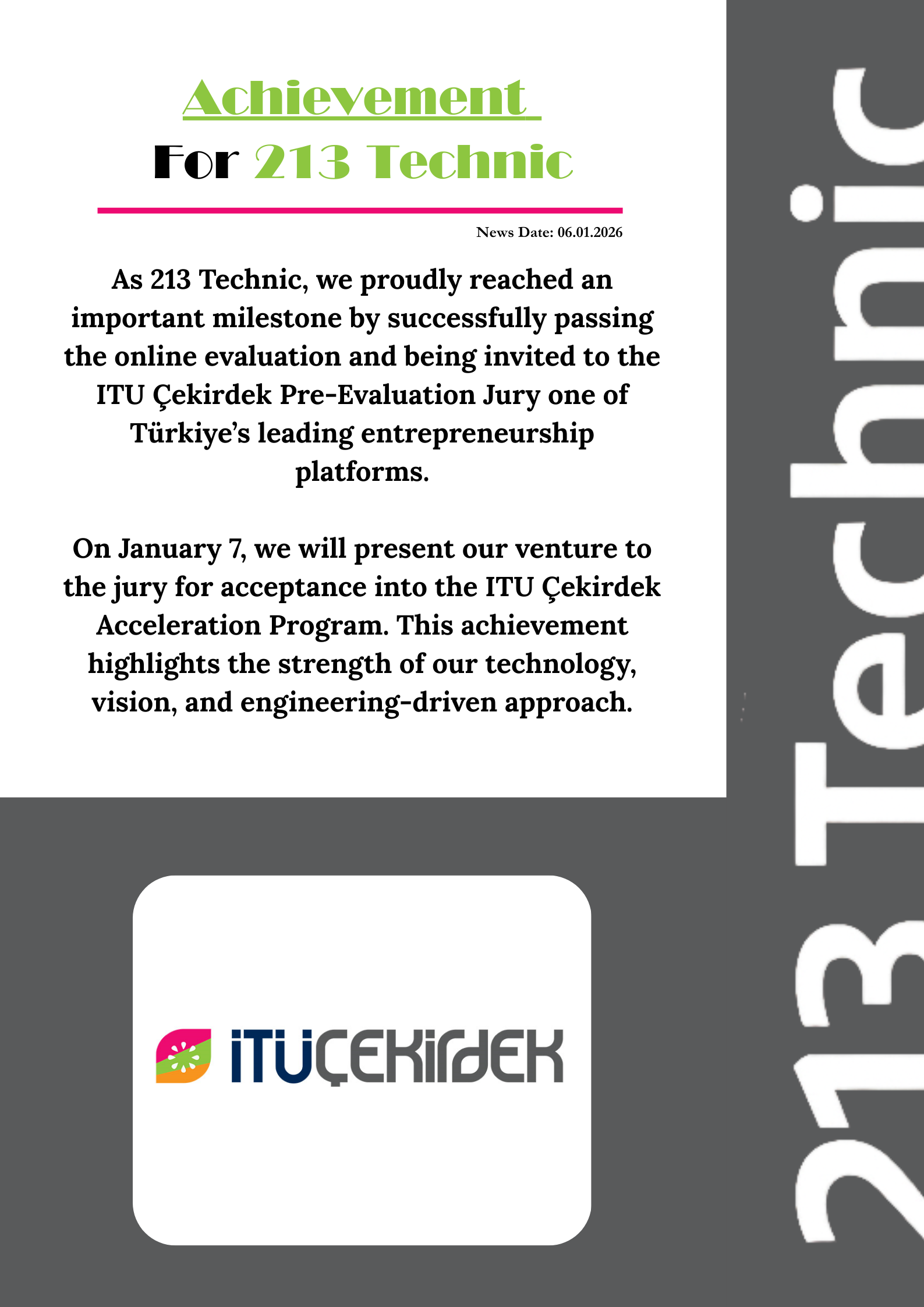 213 Technic has been invited to the ITU Çekirdek Pre-Evaluation Jury, a leading startup platform. We are excited to present our venture and advance our technology-driven vision.