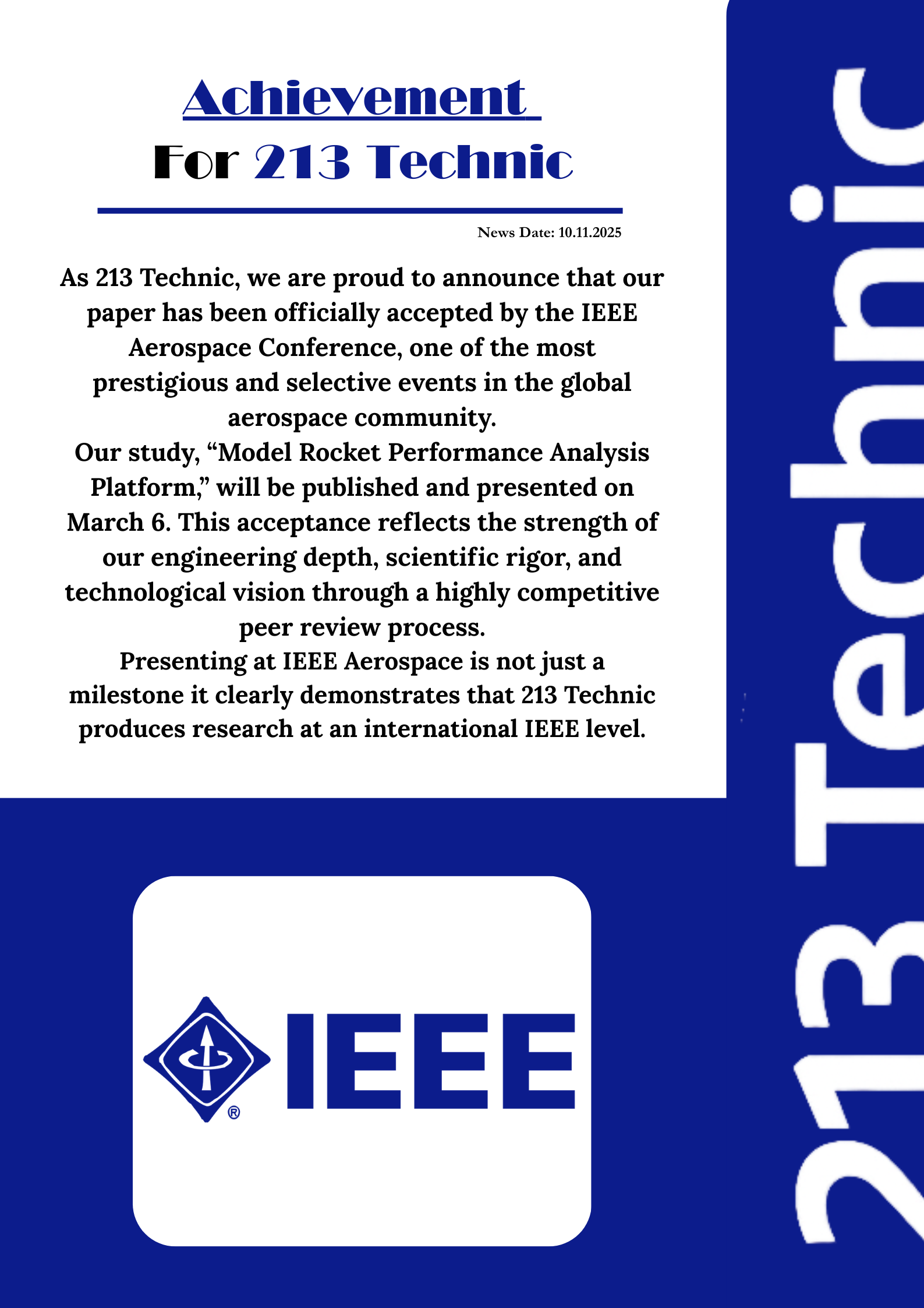 Our research paper will be published and presented at the prestigious IEEE Aerospace Conference. This achievement demonstrates our commitment to engineering excellence at an international level.