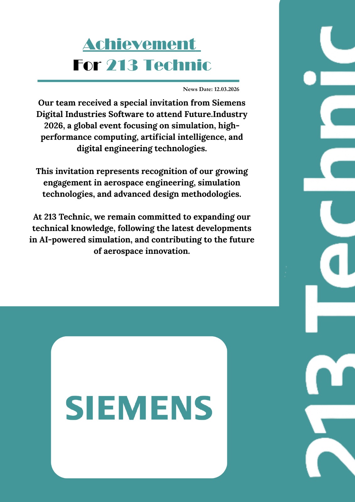 We received a special invitation from Siemens Digital Industries Software to attend Future.Industry 2026, a global event on simulation, AI, and digital engineering. This reflects our growing engagement in aerospace simulation and our commitment to innovation.