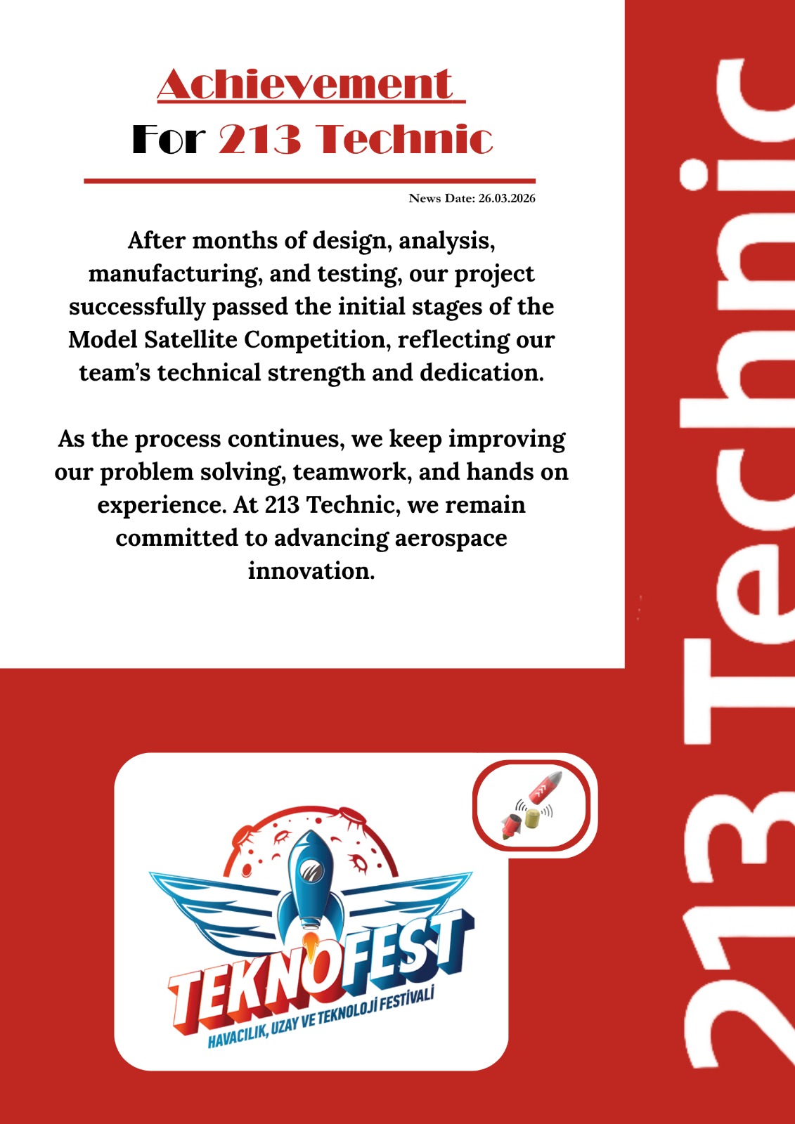 We are proud to have successfully passed the initial stages of the TEKNOFEST Model Satellite Competition. This achievement reflects our team's engineering capability, determination, and commitment to advancing aerospace technologies.
